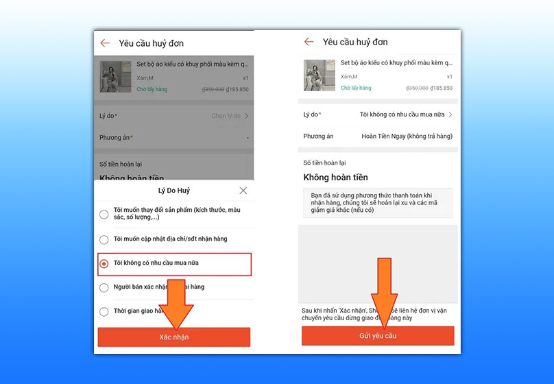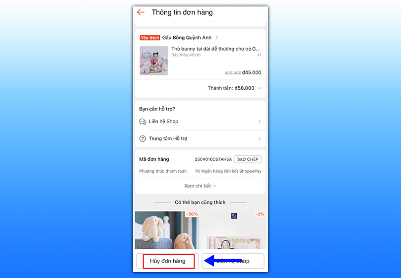 Mẹo nhỏ: Hãy nhắn tin trực tiếp cho shop để trình bày lý do (ví dụ: đặt nhầm sản phẩm, nhập sai địa chỉ…) nhằm tăng khả năng được đồng ý.